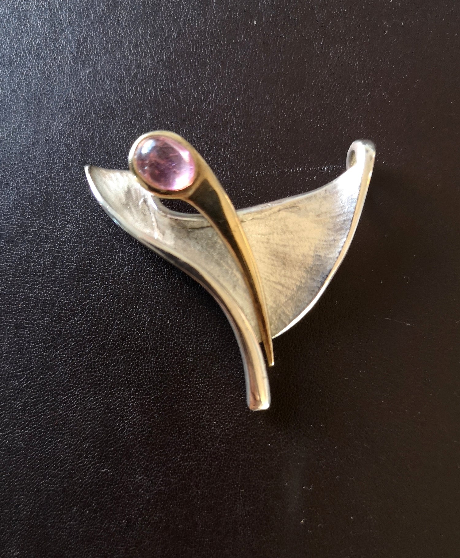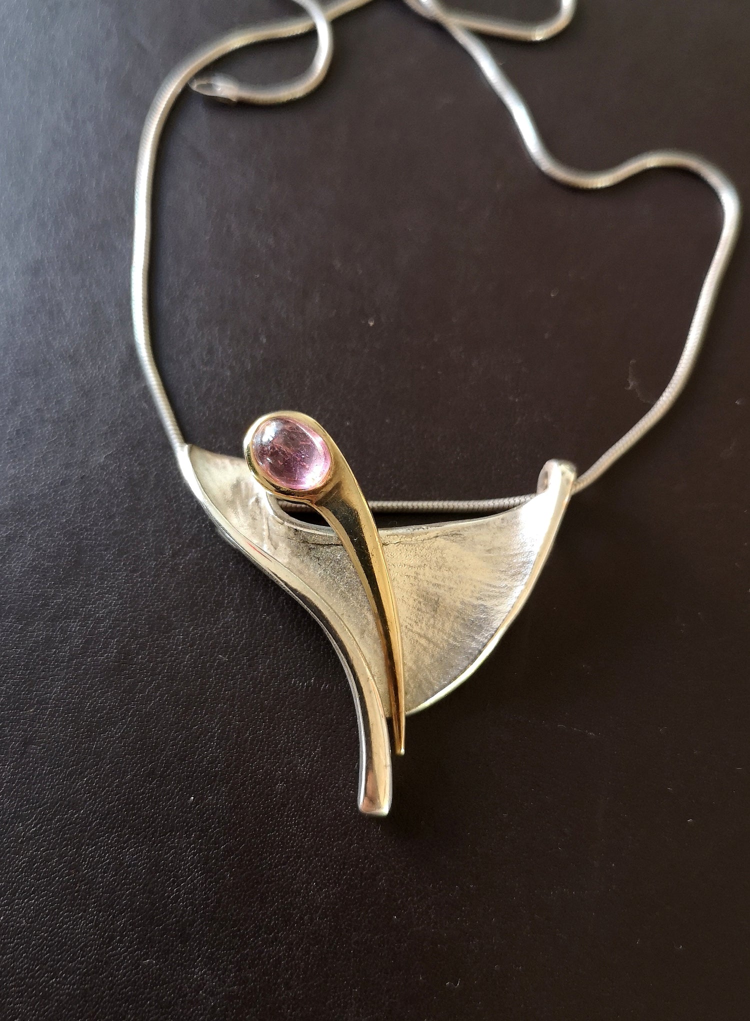 Smukt og spændende unikavedhæng i sølv og 14 karat guld, med den skønneste klare cabochonslebne pink turmalin.